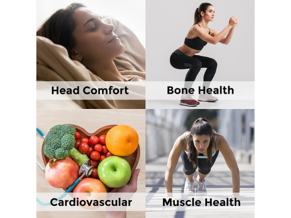 It supports normal blood pressure, bone health, and sleep quality, while also promoting head comfort and muscle health.